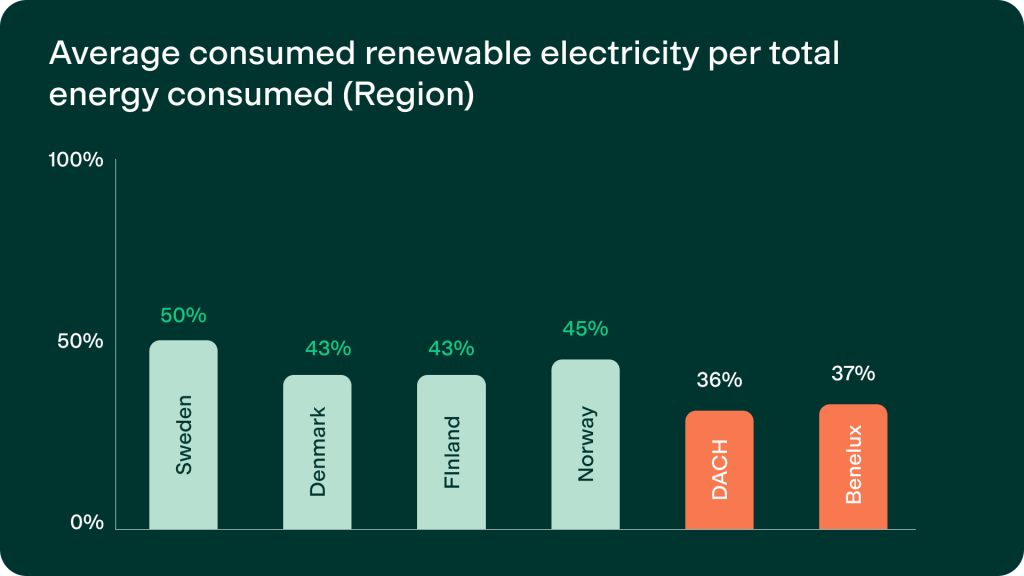 Position Green benchmark data shows that average renewable electricity consumption is approximately 50 percent in Sweden, 45 percent in Norway, and 43 percent in both Denmark and Finland.